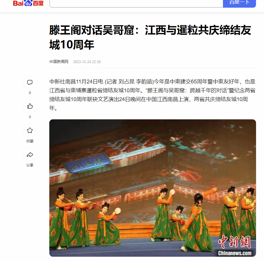 中新社南昌11月24日电 (记者 刘占昆 李韵涵)今年是中柬建交65周年暨中柬友好年,也是江西省与柬埔寨暹粒省缔结友城10周年。“滕王阁与吴哥窟:跨越千年的对话”暨纪念两省缔结友城10周年联袂文艺演出24日晚间在中国江西南昌上演,两省共庆缔结友城10周年。