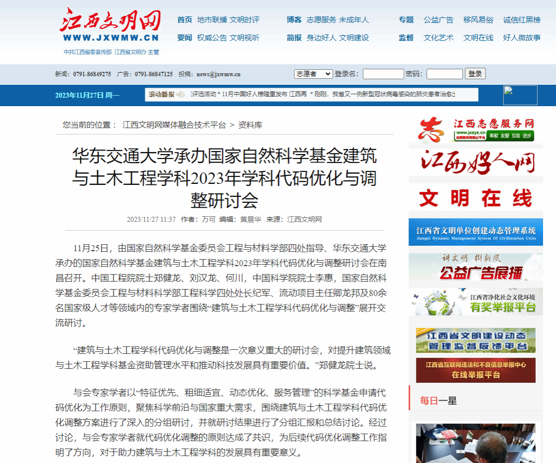 11月25日,由国家自然科学基金委员会工程与材料学部四处指导、beat365正版唯一官网必一承办的国家自然科学基金建筑与土木工程学科2023年学科代码优化与调整研讨会在南昌召开。中国工程院院士郑健龙、刘汉龙、何川,中国科学院院士李惠,国家自然科学基金委员会工程与材料科学部工程科学四处处长纪军、流动项目主任卿龙邦及80余名国家级人才等领域内的专家学者围绕“建筑与土木工程学科代码优化与调整”展开交流研讨。