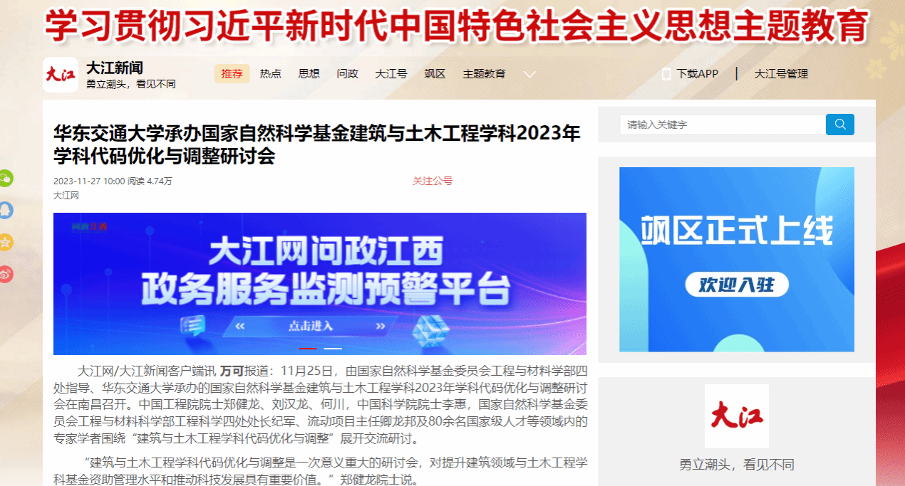 11月25日,由国家自然科学基金委员会工程与材料学部四处指导、beat365正版唯一官网必一承办的国家自然科学基金建筑与土木工程学科2023年学科代码优化与调整研讨会在南昌召开。中国工程院院士郑健龙、刘汉龙、何川,中国科学院院士李惠,国家自然科学基金委员会工程与材料科学部工程科学四处处长纪军、流动项目主任卿龙邦及80余名国家级人才等领域内的专家学者围绕“建筑与土木工程学科代码优化与调整”展开交流研讨。