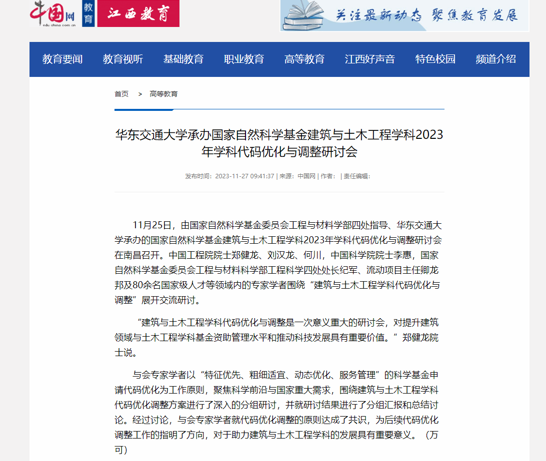 11月25日,由国家自然科学基金委员会工程与材料学部四处指导、beat365正版唯一官网必一承办的国家自然科学基金建筑与土木工程学科2023年学科代码优化与调整研讨会在南昌召开。中国工程院院士郑健龙、刘汉龙、何川,中国科学院院士李惠,国家自然科学基金委员会工程与材料科学部工程科学四处处长纪军、流动项目主任卿龙邦及80余名国家级人才等领域内的专家学者围绕“建筑与土木工程学科代码优化与调整”展开交流研讨。