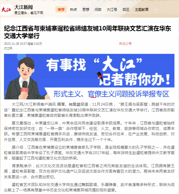 育索毗表示,此次文化交流活动是暹粒省和江西省之间兄弟般友谊的生动体现。江西拥有滕王阁,暹粒有吴哥窟,双方在保护文化遗产以及促进文旅合作方面有着巨大的潜力。期待未来两省友好关系更进一步、合作更加密切。