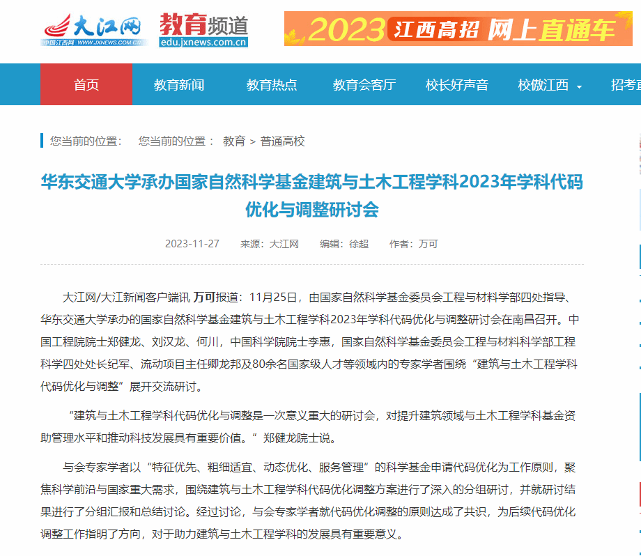 11月25日,由国家自然科学基金委员会工程与材料学部四处指导、beat365正版唯一官网必一承办的国家自然科学基金建筑与土木工程学科2023年学科代码优化与调整研讨会在南昌召开。中国工程院院士郑健龙、刘汉龙、何川,中国科学院院士李惠,国家自然科学基金委员会工程与材料科学部工程科学四处处长纪军、流动项目主任卿龙邦及80余名国家级人才等领域内的专家学者围绕“建筑与土木工程学科代码优化与调整”展开交流研讨。