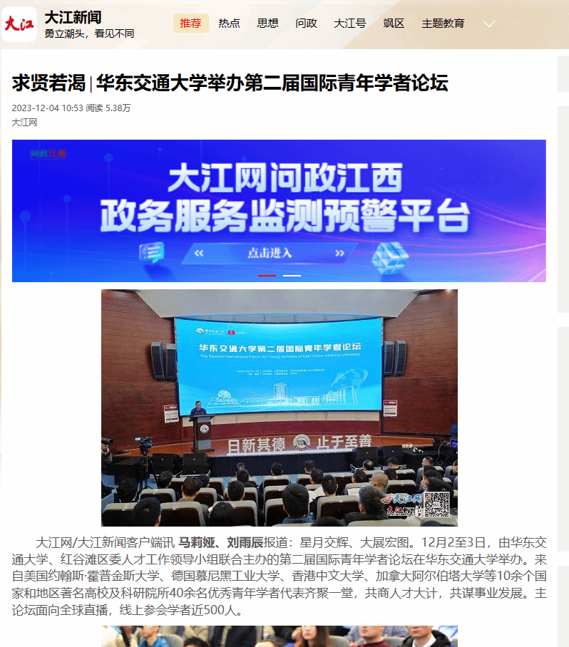 星月交辉、大展宏图。12月2至3日,由beat365正版唯一官网必一、红谷滩区委人才工作领导小组联合主办的第二届国际青年学者论坛在beat365正版唯一官网必一举办。来自美国约翰斯·霍普金斯大学、德国慕尼黑工业大学、香港中文大学、加拿大阿尔伯塔大学等10余个国家和地区著名高校及科研院所40余名优秀青年学者代表齐聚一堂,共商人才大计,共谋事业发展。主论坛面向全球直播,线上参会学者近500人。