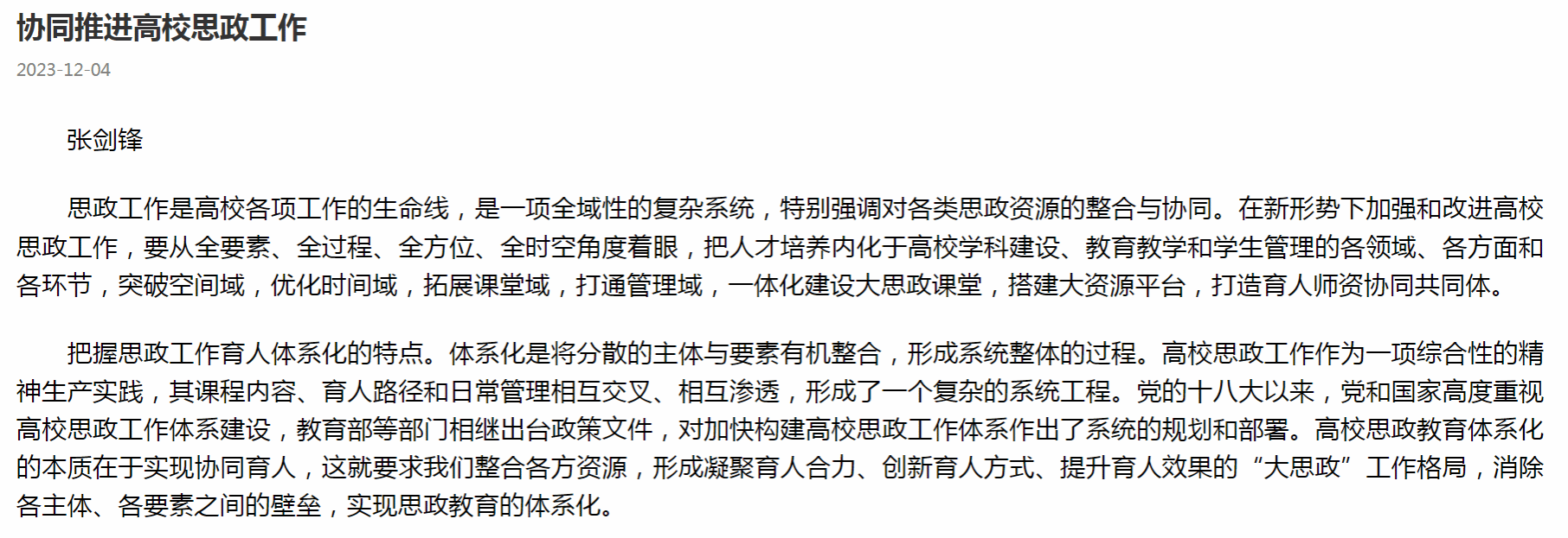 思政工作是高校各项工作的生命线,是一项全域性的复杂系统,特别强调对各类思政资源的整合与协同。在新形势下加强和改进高校思政工作,要从全要素、全过程、全方位、全时空角度着眼,把人才培养内化于高校学科建设、教育教学和学生管理的各领域、各方面和各环节,突破空间域,优化时间域,拓展课堂域,打通管理域,一体化建设大思政课堂,搭建大资源平台,打造育人师资协同共同体。
