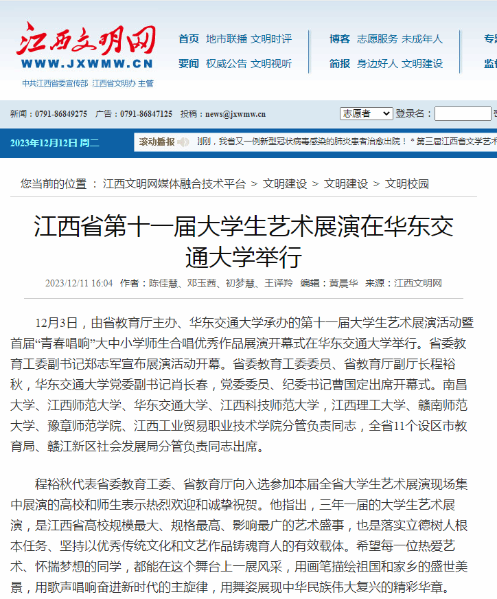 据悉,江西省第十一届大学生艺术展演活动时间为12月1日至5日,活动以“厚植家国情怀,涵养进取品格”为主题,分为艺术表演类、学生艺术实践工作坊、艺术作品类和高校美育改革创新优秀案例四大类,共吸引了来自全省共31所高校,133个艺术表演类节目、艺术作品、艺术实践工作坊和作品展参加省级展演展评。首届“青春唱响”大中小学师生合唱优秀作品展演根据选拔,共有全省28个大中小学校进入省级现场展示。
