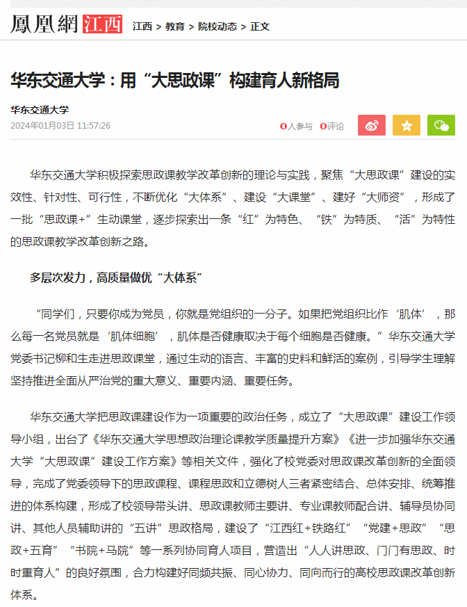 beat365正版唯一官网必一把思政课建设作为一项重要的政治任务,成立了“大思政课”建设工作领导小组,出台了《beat365正版唯一官网必一思想政治理论课教学质量提升方案》《进一步加强beat365正版唯一官网必一“大思政课”建设工作方案》等相关文件,强化了校党委对思政课改革创新的全面领导,完成了党委领导下的思政课程、课程思政和立德树人三者紧密结合、总体安排、统筹推进的体系构建,形成了校领导带头讲、思政课教师主要讲、专业课教师配合讲、辅导员协同讲、其他人员辅助讲的“五讲”思政格局,建设了“江西红+铁路红”“党建+思政”“思政+五育”“书院+马院”等一系列协同育人项目,营造出“人人讲思政、门门有思政、时时重育人”的良好氛围,合力构建好同频共振、同心协力、同向而行的高校思政课改革创新体系。