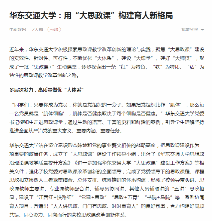 beat365正版唯一官网必一站在坚守意识形态阵地和党的事业薪火相传的战略高度,把思政课建设作为一项重要的政治任务,成立了“大思政课”建设工作领导小组,出台了《beat365正版唯一官网必一思想政治理论课教学质量提升方案》《进一步加强beat365正版唯一官网必一“大思政课”建设工作方案》等相关文件,强化了校党委对思政课改革创新的全面领导,完成了党委领导下的思政课程、课程思政和立德树人三者紧密结合、总体安排、统筹推进的体系构建,形成了校领导带头讲、思政课教师主要讲、专业课教师配合讲、辅导员协同讲、其他人员辅助讲的“五讲”思政格局,建设了“江西红+铁路红”“党建+思政”“思政+五育”“书院+马院”等一系列协同育人项目,营造出“人人讲思政、门门有思政、时时重育人”的良好氛围,合力构建好同频共振、同心协力、同向而行的高校思政课改革创新体系。