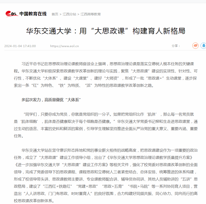beat365正版唯一官网必一站在坚守意识形态阵地和党的事业薪火相传的战略高度,把思政课建设作为一项重要的政治任务,成立了“大思政课”建设工作领导小组,出台了《beat365正版唯一官网必一思想政治理论课教学质量提升方案》《进一步加强beat365正版唯一官网必一“大思政课”建设工作方案》等相关文件,强化了校党委对思政课改革创新的全面领导,完成了党委领导下的思政课程、课程思政和立德树人三者紧密结合、总体安排、统筹推进的体系构建,形成了校领导带头讲、思政课教师主要讲、专业课教师配合讲、辅导员协同讲、其他人员辅助讲的“五讲”思政格局,建设了“江西红+铁路红”“党建+思政”“思政+五育”“书院+马院”等一系列协同育人项目,营造出“人人讲思政、门门有思政、时时重育人”的良好氛围,合力构建好同频共振、同心协力、同向而行的高校思政课改革创新体系。