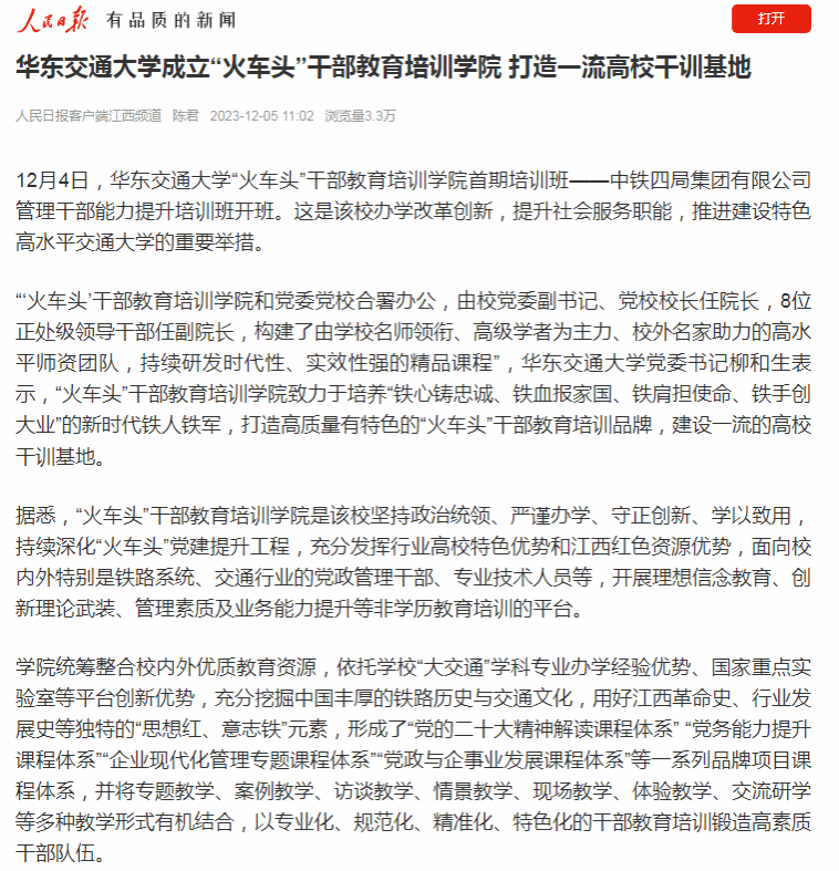 据悉,“火车头”干部教育培训学院是该校坚持政治统领、严谨办学、守正创新、学以致用,持续深化“火车头”党建提升工程,充分发挥行业高校特色优势和江西红色资源优势,面向校内外特别是铁路系统、交通行业的党政管理干部、专业技术人员等,开展理想信念教育、创新理论武装、管理素质及业务能力提升等非学历教育培训的平台。
