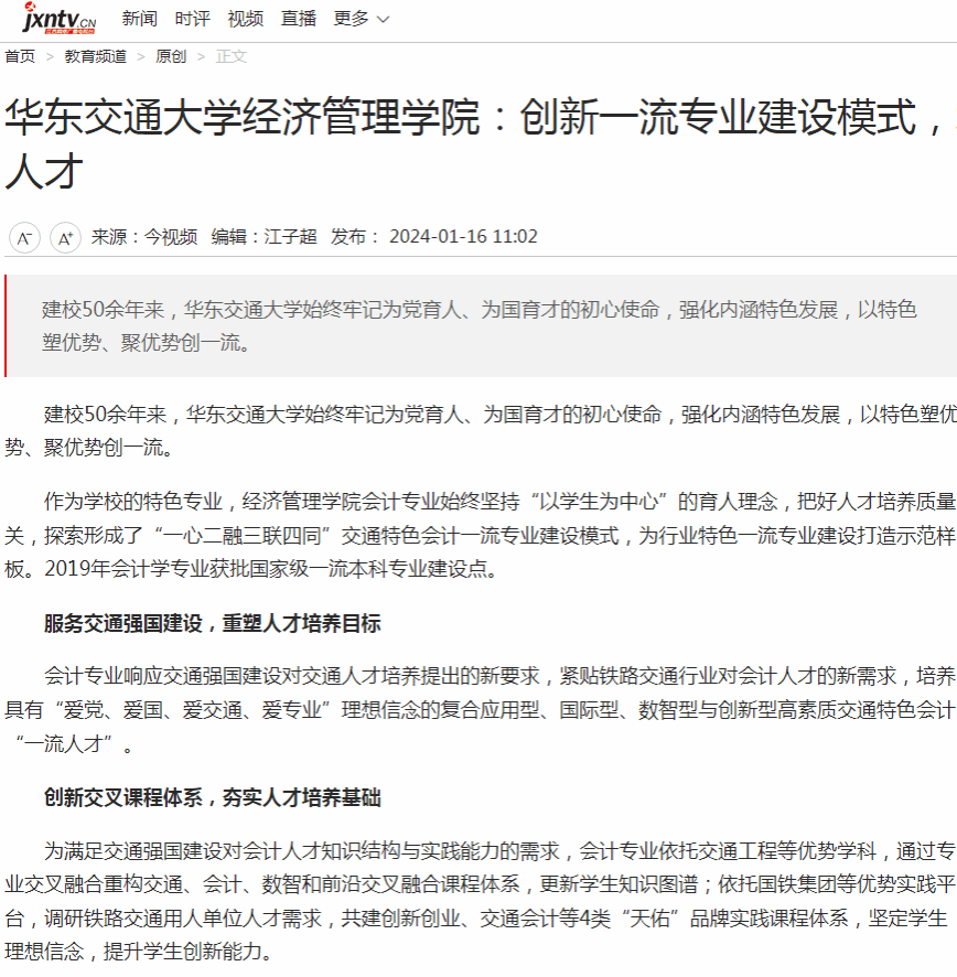 作为学校的特色专业,经济管理学院会计专业始终坚持“以学生为中心”的育人理念,把好人才培养质量关,探索形成了“一心二融三联四同”交通特色会计一流专业建设模式,为行业特色一流专业建设打造示范样板。2019年会计学专业获批国家级一流本科专业建设点。