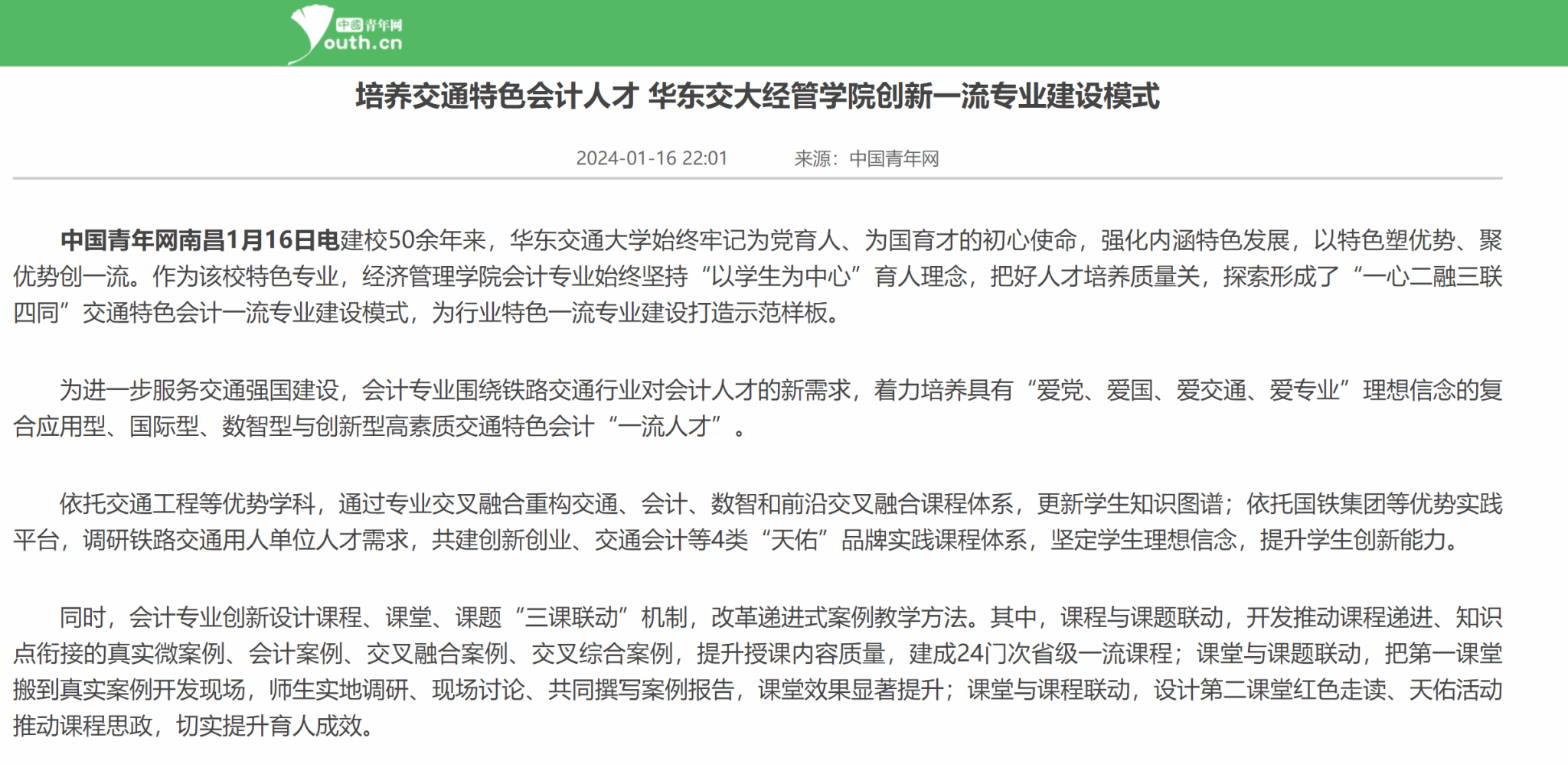 为进一步服务交通强国建设,会计专业围绕铁路交通行业对会计人才的新需求,着力培养具有“爱党、爱国、爱交通、爱专业”理想信念的复合应用型、国际型、数智型与创新型高素质交通特色会计“一流人才”。