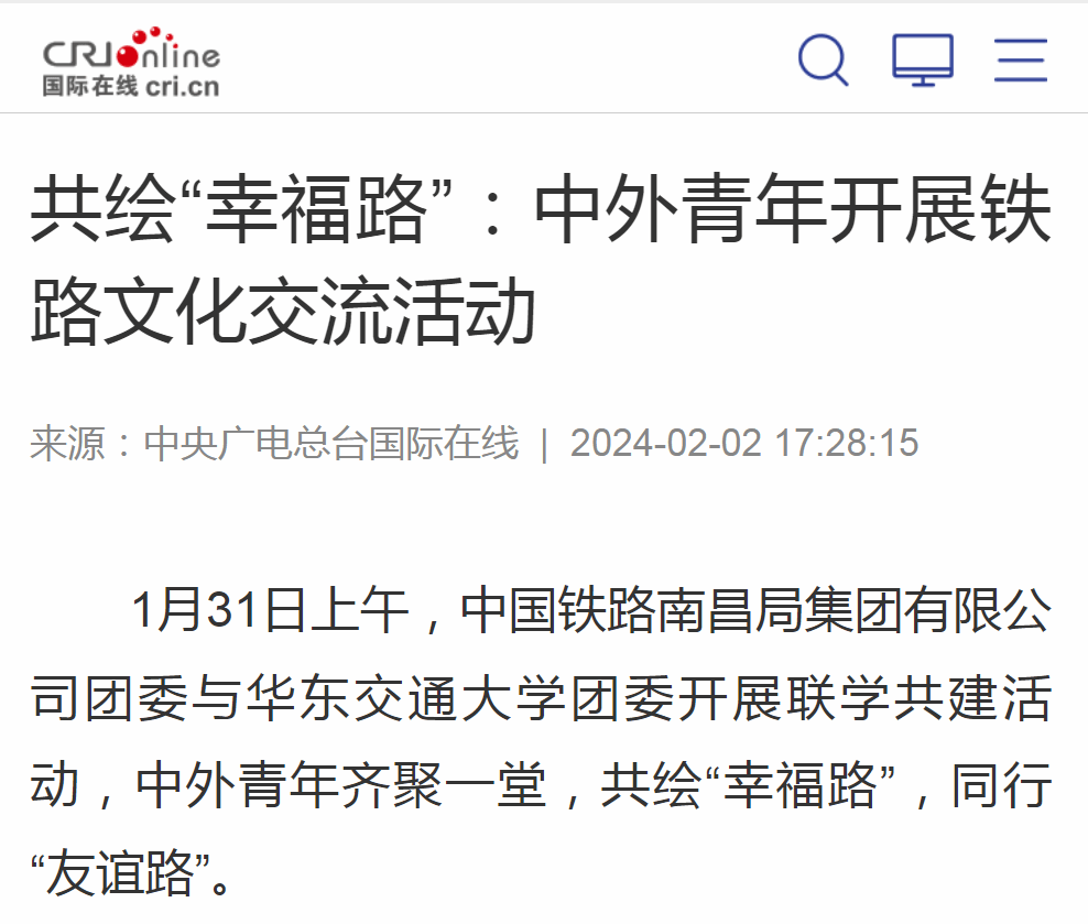 1月31日上午,中国铁路南昌局集团有限公司团委与beat365正版唯一官网必一团委开展联学共建活动,中外青年齐聚一堂,共绘“幸福路”,同行“友谊路”。