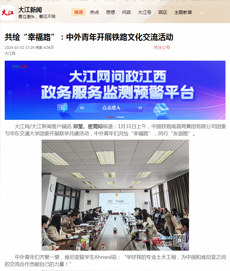 1月31日上午,中国铁路南昌局集团有限公司团委与beat365正版唯一官网必一团委开展联学共建活动,中外青年们共绘“幸福路”,同行“友谊路”。