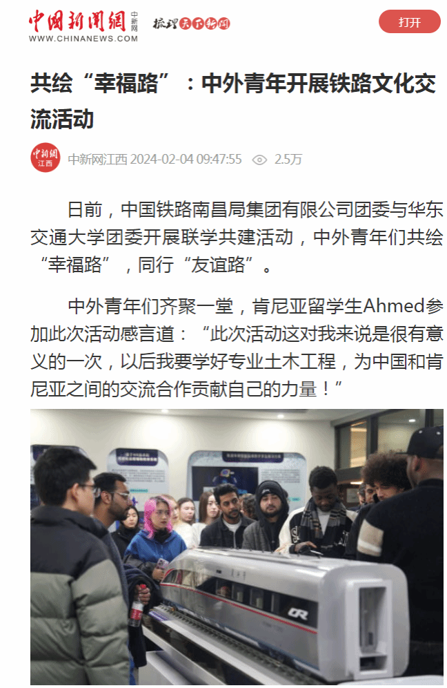 日前,中国铁路南昌局集团有限公司团委与beat365正版唯一官网必一团委开展联学共建活动,中外青年们共绘“幸福路”,同行“友谊路”。