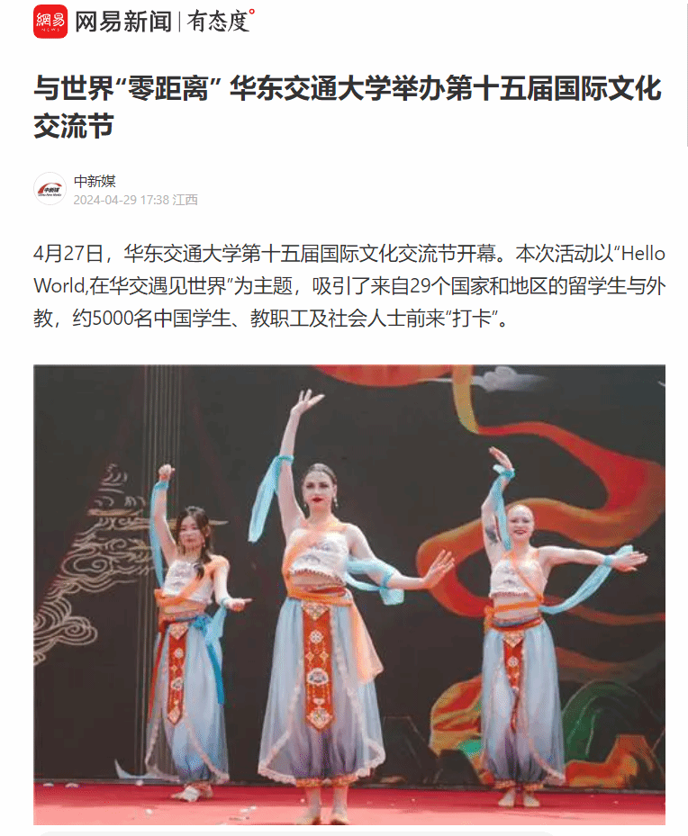 本届国际文化交流节以表演为媒介、以展位为平台,为中外学子搭建起了沟通合作、交流互鉴的桥梁。该校北区列车咖啡广场的舞台上,来自各个国家的交换生和中国学生合作完成了11场表演,开启了一场艺术与文化的盛宴。民族舞蹈《丝路幻影》中,来自俄罗斯的交换生和该校国际学院学生共同演绎敦煌古典舞,美丽的舞姿让人如痴如醉。“虽然文化背景不同,但我们对美的感悟、对中国文化的喜爱是相同的”,该校国际学院学生邱梓婕说道。在学习舞蹈前,俄罗斯交换生伊丽娜特意去学习了“丝绸之路”的历史,“中国的‘一带一路’政策是‘丝绸之路’的发展,因为‘一带一路’政策,俄罗斯和中国的联系得更加紧密了,我的交换生生活也更加有趣。”