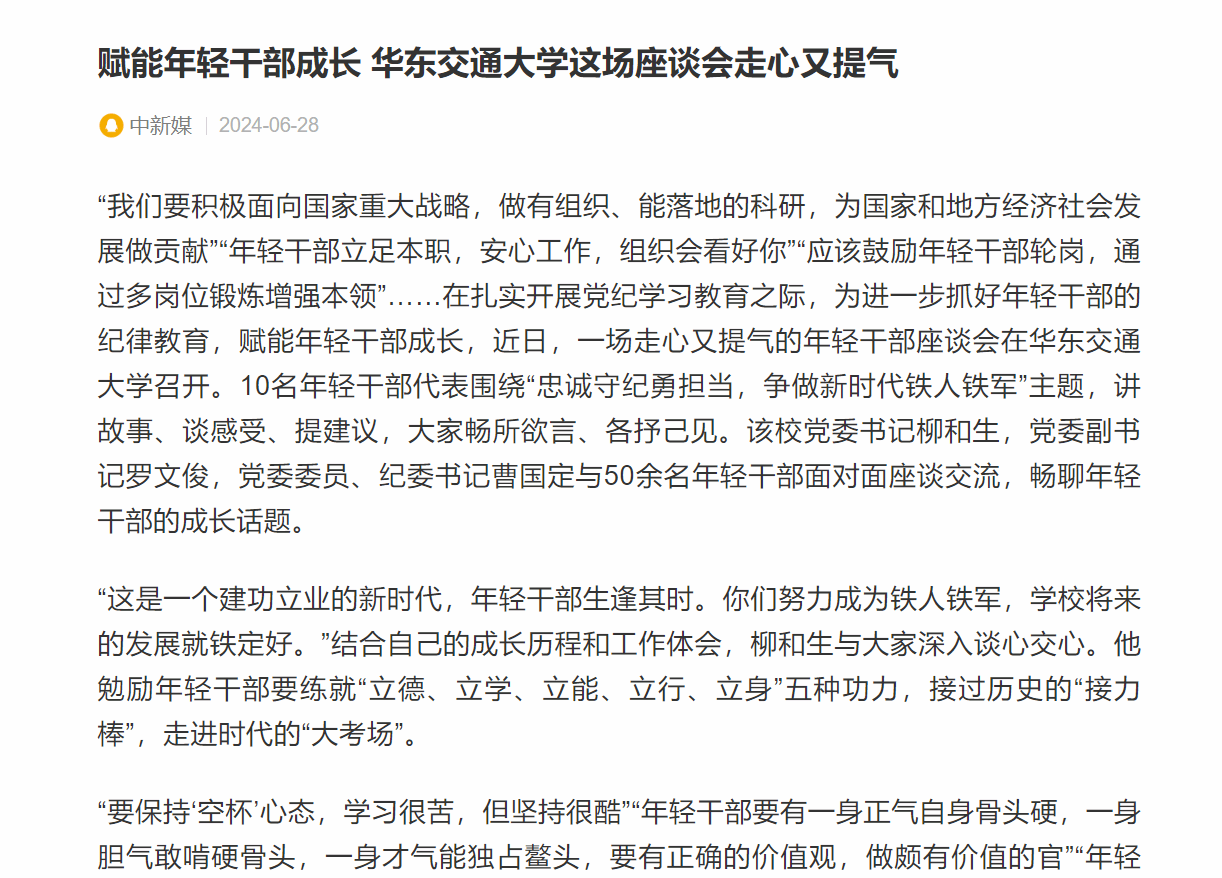“要保持‘空杯’心态,学习很苦,但坚持很酷”“年轻干部要有一身正气自身骨头硬,一身胆气敢啃硬骨头,一身才气能独占鳌头,要有正确的价值观,做颇有价值的官”“年轻干部要耐苦、耐劳、耐烦、耐寂寞,还要耐得住批评。要干实事、干出事实,要有干劲、又很干净,以步进得进步、以功成求成功,努力成为不中庸、有忠勇、可重用的栋梁之材”……一句句真诚的话语令在场的年轻干部产生强烈的共鸣。他们纷纷表示,此次座谈会既走心又入心,有深度更有温度,充分体现了学校对年轻干部的关心关爱。