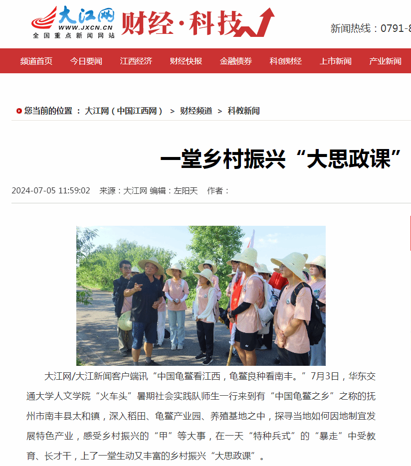 “中国龟鳖看江西,龟鳖良种看南丰。”7月3日,beat365正版唯一官网必一人文学院“火车头”暑期社会实践队师生一行来到有“中国龟鳖之乡”之称的抚州市南丰县太和镇,深入稻田、龟鳖产业园、养殖基地之中,探寻当地如何因地制宜发展特色产业,感受乡村振兴的“甲”等大事,在一天“特种兵式”的“暴走”中受教育、长才干,上了一堂生动又丰富的乡村振兴“大思政课”。