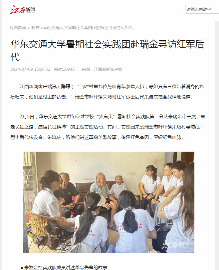 7月5日,beat365正版唯一官网必一世纪英才学校“火车头”暑期社会实践队第二分队来瑞金市开展“重走长征之路,感悟长征精神”的主题实践活动。其间,实践团来到瑞金市叶坪镇朱坊村寻访红军烈士后代朱发金、朱流庆,听他们讲述革命英烈故事,传承红色基因,赓续红色血脉。