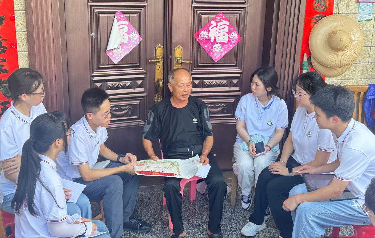 朱发金是党龄68年的老党员,也是一名红军后代。他听说实践队要来,早早佩戴上了助听器,摆好了凳子,还精心准备了一份数千余字的稿子。“我不会说普通话,就怕同学们听不懂我讲的方言。”朱发金认真地说道。93岁的朱发金戴着助听器、佝偻着背、语气沉重地给实践队成员讲述革命先辈的故事。合影留念后,朱发金紧紧握住同学的手,语重心长地说道:“你们要用实际行动报效祖国和人民,传承红色基因。”