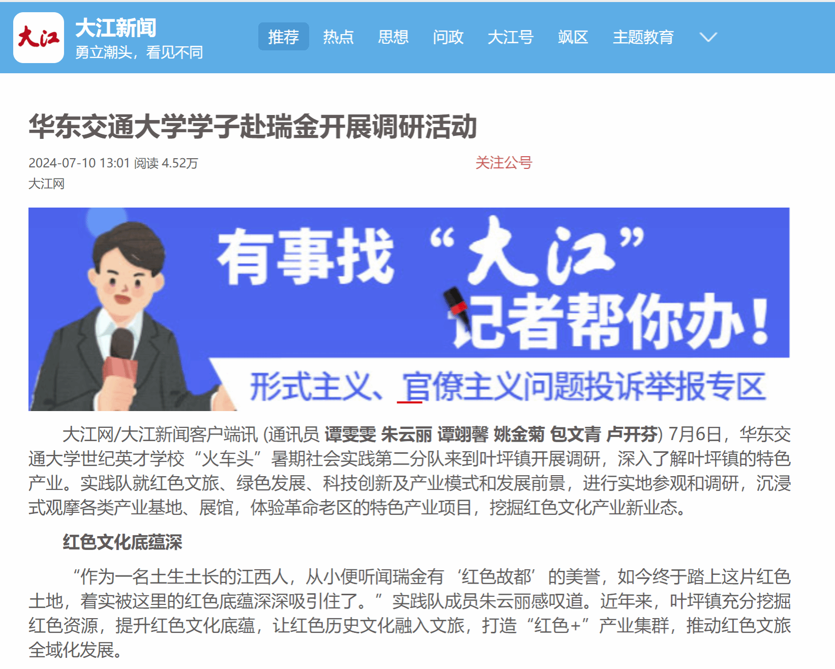 7月6日,beat365正版唯一官网必一世纪英才学校“火车头”暑期社会实践第二分队来到叶坪镇开展调研,深入了解叶坪镇的特色产业。实践队就红色文旅、绿色发展、科技创新及产业模式和发展前景,进行实地参观和调研,沉浸式观摩各类产业基地、展馆,体验革命老区的特色产业项目,挖掘红色文化产业新业态。