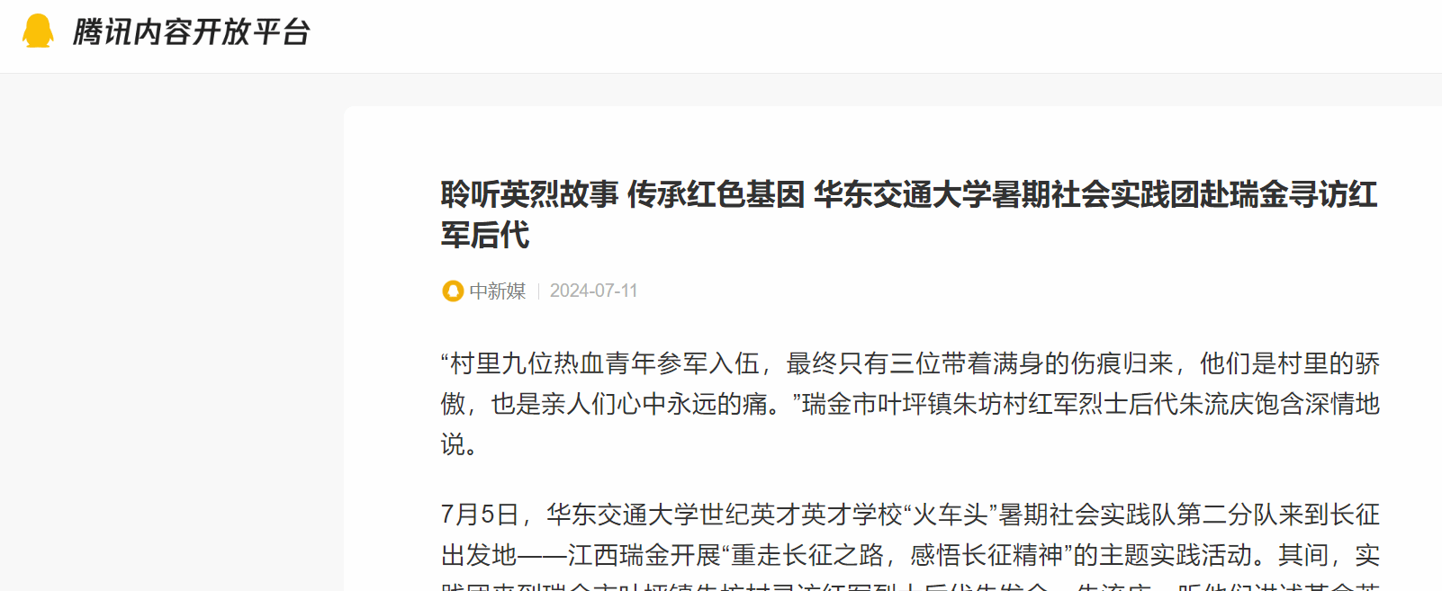 “一代人有一代人的长征,一代人有一代人的使命。红军后代们接过先辈们的接力棒,用自己的方式讲述革命故事、传承长征精神。作为新时代青年,我们更要赓续红色血脉、汲取精神养分、矢志挺膺担当,走好新时代‘长征路’,让青春在党和人民最需要的地方绽放绚丽之花。”实践团队长徐亮说。