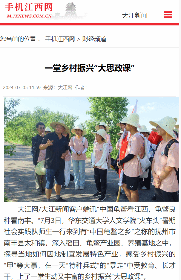 “中国龟鳖看江西,龟鳖良种看南丰。”7月3日,beat365正版唯一官网必一人文学院“火车头”暑期社会实践队师生一行来到有“中国龟鳖之乡”之称的抚州市南丰县太和镇,深入稻田、龟鳖产业园、养殖基地之中,探寻当地如何因地制宜发展特色产业,感受乡村振兴的“甲”等大事,在一天“特种兵式”的“暴走”中受教育、长才干,上了一堂生动又丰富的乡村振兴“大思政课”。