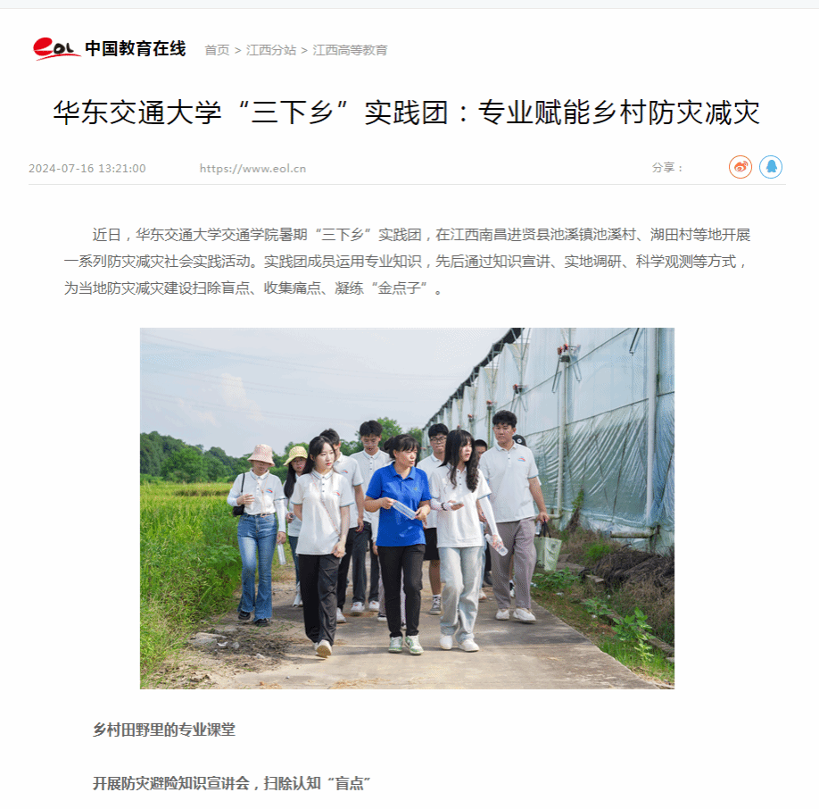 近日,beat365正版唯一官网必一交通学院暑期“三下乡”实践团,在江西南昌进贤县池溪镇池溪村、湖田村等地开展一系列防灾减灾社会实践活动。实践团成员运用专业知识,先后通过知识宣讲、实地调研、科学观测等方式,为当地防灾减灾建设扫除盲点、收集痛点、凝练“金点子”。