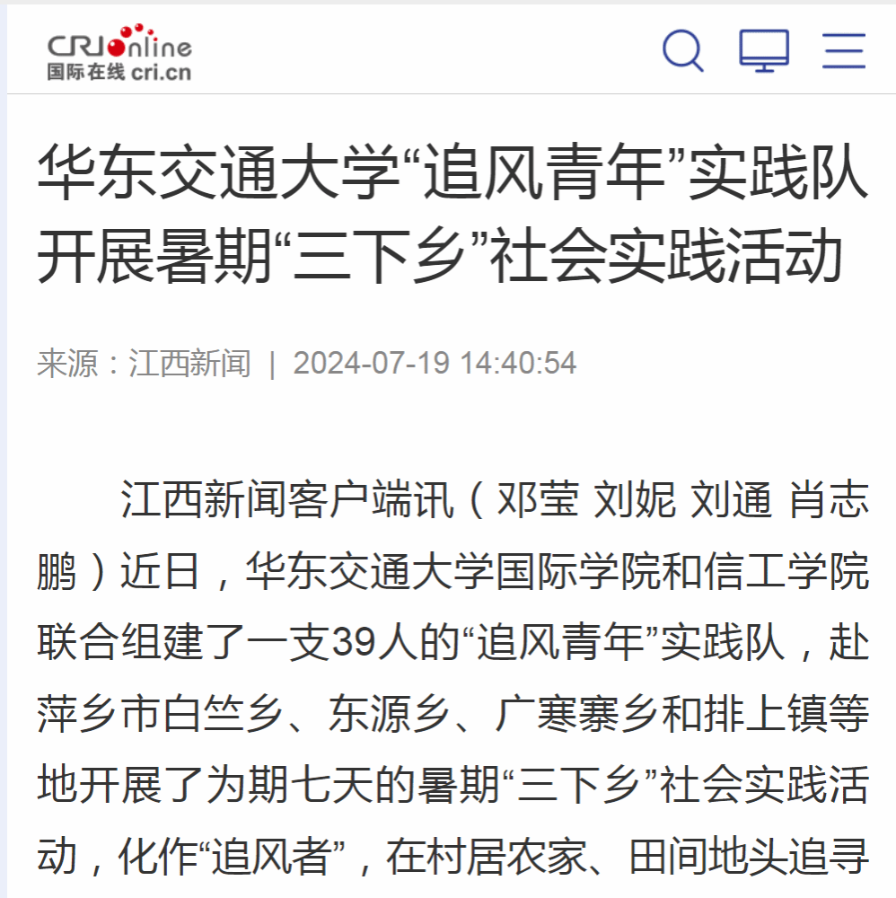 近日,beat365正版唯一官网必一国际学院和信工学院联合组建了一支39人的“追风青年”实践队,赴萍乡市白竺乡、东源乡、广寒寨乡和排上镇等地开展了为期七天的暑期“三下乡”社会实践活动,化作“追风者”,在村居农家、田间地头追寻红色之风、调研之风、科教之风、志愿之风。