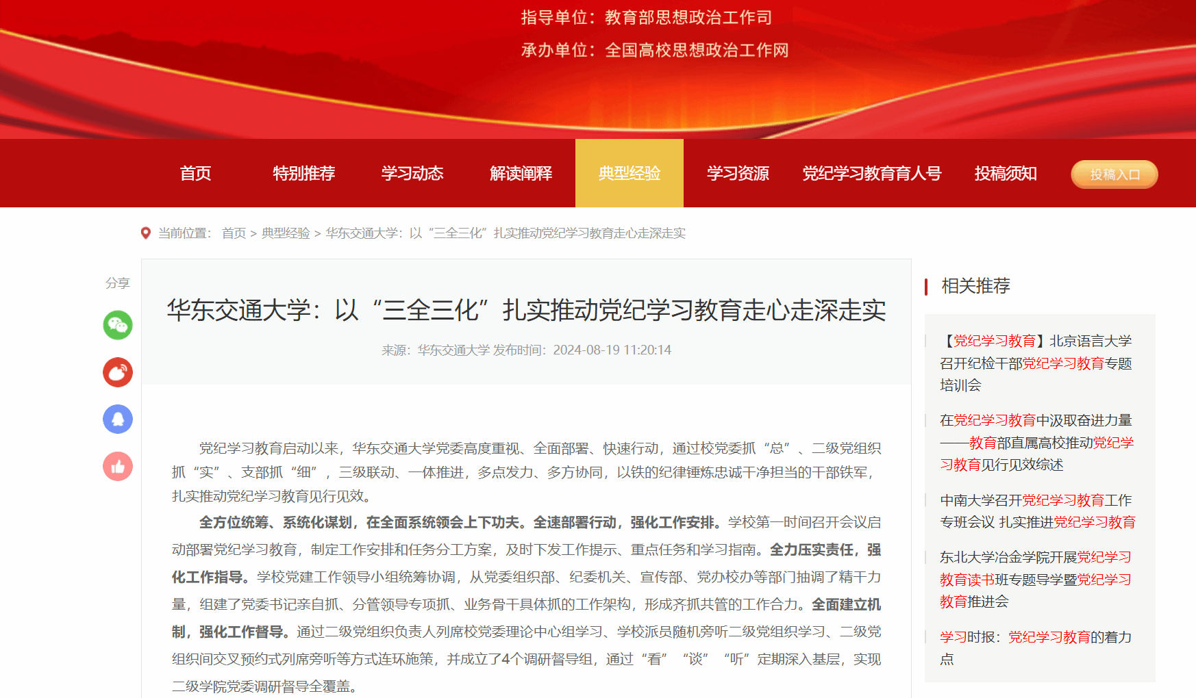全过程贯穿、实质化落实,在抓实学习成效上下功夫。抓好警示教育。制定警示教育计划,分批组织中层以上干部及年轻干部、关键岗位干部、新提拔干部等赴监狱、廉政教育基地等开展“沉浸式”警示教育;各单位深入挖掘警示教育资源,结合实际分类开展科研诚信、师德师风、教风学风等警示教育,做到党员全覆盖。抓好关键岗位干部的警示教育,学校纪委书记带头在各类培训会议上解读、剖析违纪的原因、教训,让纪律规矩更加入脑入心;用好学校警示教育专栏,把点名道姓通报曝光身边违纪案例作为以案说纪的有效手段,提高学习的针对性和实效性;严格落实对口联系制度,安排纪检监察干部对接相关基层党组织指导开展警示教育,靶向解读《条例》;对受处分干部开展回访教育,不断深化纪律学习警示教育工作,及时做好教育转化、跟踪联系和心理疏导;集中纠治推诿扯皮、拈轻怕重、蜻蜓点水的工作“病态”,进一步解决“干部不干”问题;修订处级干部年度考核办法,落实“三个区分开来”,旗帜鲜明地为敢于担当的干部撑腰鼓劲。抓实检视整改。坚持边检视、边提高,各单位通过梳理风险点、制定防范措施进一步深化对权力集中、资金密集、资源富集领域和关键岗位党员、干部的警示教育。以深化巡视整改为契机,分阶段开展作风建设专项整治,集中整治缺乏担当、“老好人”思想、执行制度不力等问题。扎实推进基础教育领域不正之风和腐败问题专项治理、师风学风有关问题自查自纠和教师违规接受学生吃请问题治理。紧盯“一把手”和领导班子、师生反映强烈的问题,深入查找和推动解决校属各单位在履行党的领导职责、深化教育教学改革等方面存在的问题。抓出工作成效。把开展党纪学习教育同落实党中央、省委决策部署结合起来,同推进学校重点工作紧密结合起来,学校召开巡视整改、综合考核、党纪学习教育工作推进会,高效率推进3项重点工作,推动拧紧一级抓一级、层层抓落实的责任链条。开展“担当作为好干部”、“新时代赣鄱先锋”创绩提升行动等,深入实施“火车头”党建提升工程,入选第四批全国党建工作标杆院系、样板支部培育创建单位各1个,首批全省高校“十个研究生样板党支部”和“十名研究生党员标兵”各1个,2个全国党建工作样板支部培育创建单位完成验收。围绕提升高层次人才总量、增强学科建设水平、强化服务交通强省能力等中心工作,全速推动人才强校战略,攻坚关键性技术和原创成果,把学习教育成果不断转化为加快学校内涵式高质量发展的强大动力。