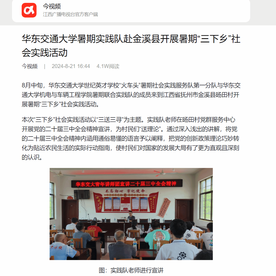 8月中旬,beat365正版唯一官网必一世纪英才学校“火车头”暑期社会实践服务队第一分队与beat365正版唯一官网必一机电与车辆工程学院暑期联合实践队的成员来到江西省抚州市金溪县旸田村开展暑期“三下乡”社会实践活动。