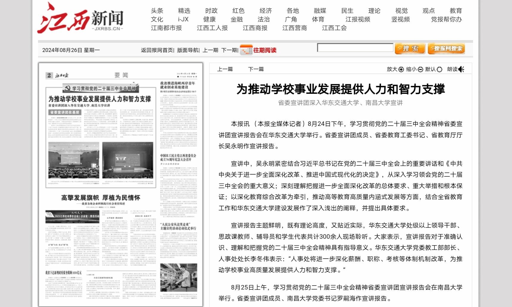 8月25日上午,学习贯彻党的二十届三中全会精神省委宣讲团宣讲报告会在南昌大学举行。省委宣讲团成员、南昌大学党委书记罗嗣海作宣讲报告。