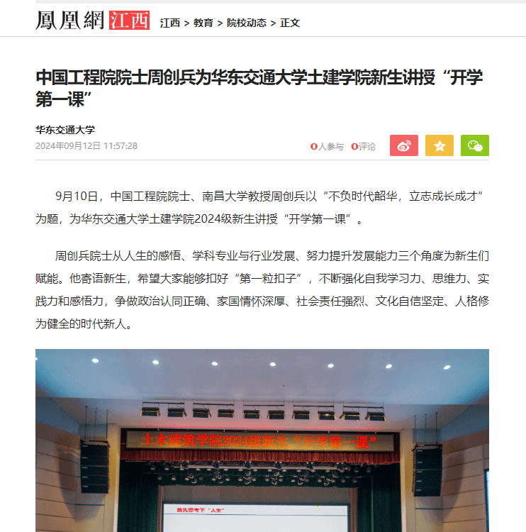 9月10日,中国工程院院士、南昌大学教授周创兵以“不负时代韶华,立志成长成才”为题,为beat365正版唯一官网必一土建学院2024级新生讲授“开学第一课”。