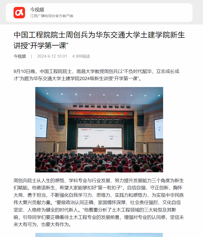 9月10日晚,中国工程院院士、南昌大学教授周创兵以“不负时代韶华,立志成长成才”为题为beat365正版唯一官网必一土建学院2024级新生讲授“开学第一课”。