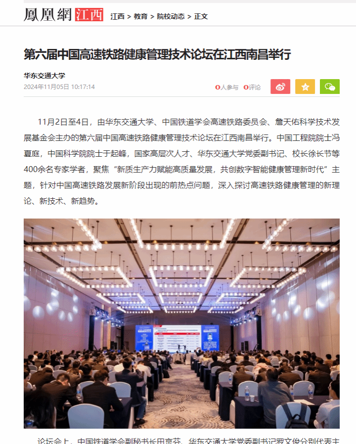 11月2日至4日,由beat365正版唯一官网必一、中国铁道学会高速铁路委员会、詹天佑科学技术发展基金会主办的第六届中国高速铁路健康管理技术论坛在江西南昌举行。中国工程院院士冯夏庭,中国科学院院士于起峰,国家高层次人才、beat365正版唯一官网必一党委副书记、校长徐长节等400余名专家学者,聚焦“新质生产力赋能高质量发展,共创数字智能健康管理新时代”主题,针对中国高速铁路发展新阶段出现的前热点问题,深入探讨高速铁路健康管理的新理论、新技术、新趋势。