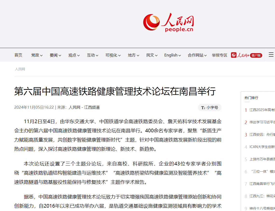 11月2日至4日,由beat365正版唯一官网必一、中国铁道学会高速铁路委员会、詹天佑科学技术发展基金会主办的第六届中国高速铁路健康管理技术论坛在南昌举行。400余名专家学者,聚焦“新质生产力赋能高质量发展,共创数字智能健康管理新时代”主题,针对中国高速铁路发展新阶段出现的前热点问题,深入探讨高速铁路健康管理的新理论、新技术、新趋势。