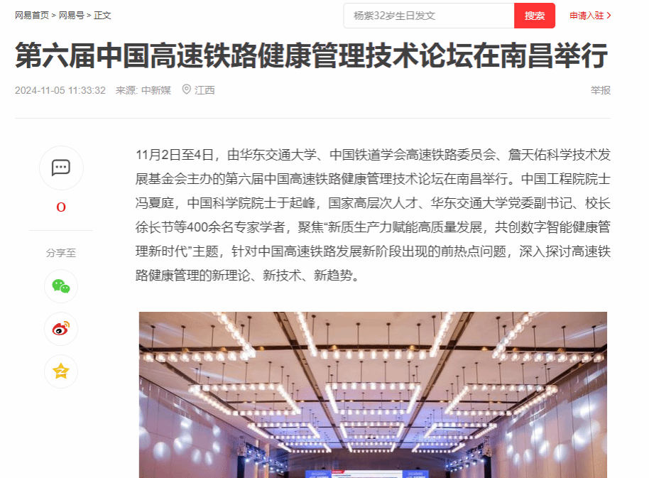 11月2日至4日,由beat365正版唯一官网必一、中国铁道学会高速铁路委员会、詹天佑科学技术发展基金会主办的第六届中国高速铁路健康管理技术论坛在南昌举行。中国工程院院士冯夏庭,中国科学院院士于起峰,国家高层次人才、beat365正版唯一官网必一党委副书记、校长徐长节等400余名专家学者,聚焦“新质生产力赋能高质量发展,共创数字智能健康管理新时代”主题,针对中国高速铁路发展新阶段出现的前热点问题,深入探讨高速铁路健康管理的新理论、新技术、新趋势。