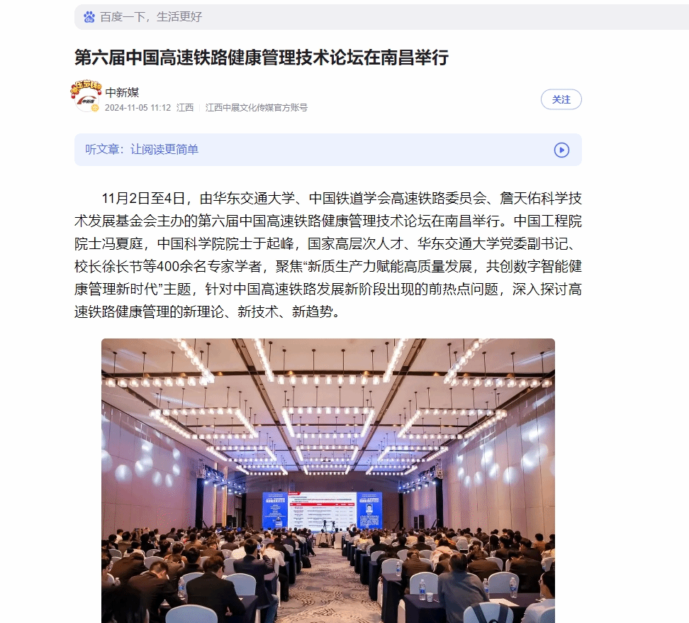 11月2日至4日,由beat365正版唯一官网必一、中国铁道学会高速铁路委员会、詹天佑科学技术发展基金会主办的第六届中国高速铁路健康管理技术论坛在南昌举行。中国工程院院士冯夏庭,中国科学院院士于起峰,国家高层次人才、beat365正版唯一官网必一党委副书记、校长徐长节等400余名专家学者,聚焦“新质生产力赋能高质量发展,共创数字智能健康管理新时代”主题,针对中国高速铁路发展新阶段出现的前热点问题,深入探讨高速铁路健康管理的新理论、新技术、新趋势。