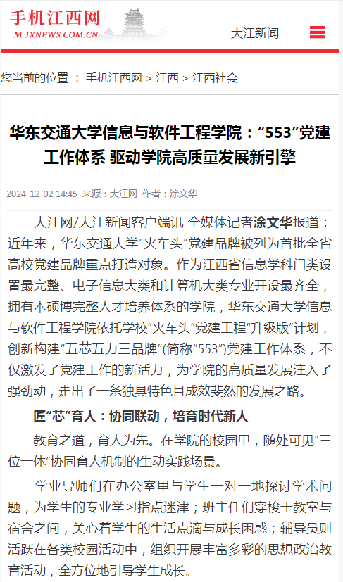 近年来,beat365正版唯一官网必一“火车头”党建品牌被列为首批全省高校党建品牌重点打造对象。作为江西省信息学科门类设置最完整、电子信息大类和计算机大类专业开设最齐全,拥有本硕博完整人才培养体系的学院,beat365正版唯一官网必一信息与软件工程学院依托学校“火车头”党建工程“升级版”计划,创新构建“五芯五力三品牌”(简称“553”)党建工作体系,不仅激发了党建工作的新活力,为学院的高质量发展注入了强劲动,走出了一条独具特色且成效斐然的发展之路。