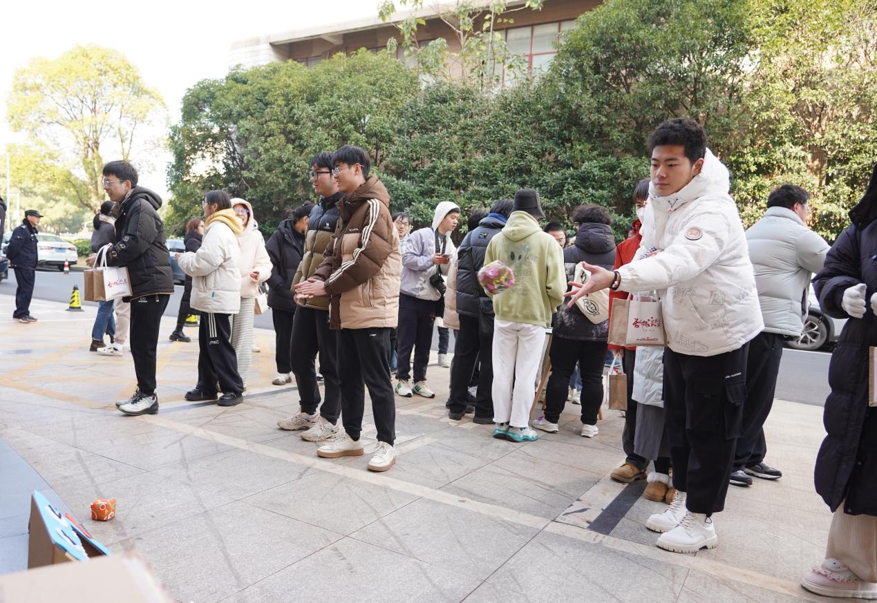 考研加油包内含考研文具套装、橙子、AD钙奶、暖手贴、向日葵或柿子香包、艾草锤等,寓意“‘文’翰功成”“一战‘橙’硕”“‘钙’力满满”“‘暖’心呵护”“向‘阳’而生” “‘柿柿’如意”“一锤定‘赢’”。活动现场,学子们在“勇掷沙包”游戏专区,一次次将沙包扔入框内,就像将紧张的情绪一并扔了出去,紧绷的神经也得到松弛;在“情绪粉碎机”前,学子们将考研之路上遇到的烦恼忧愁投入“粉碎机”,换取专属的正能量贴画,为自己加油鼓劲。该校学生魔术爱好者协会还为考研学子送上“祝福”魔术,为学子们加油打气。