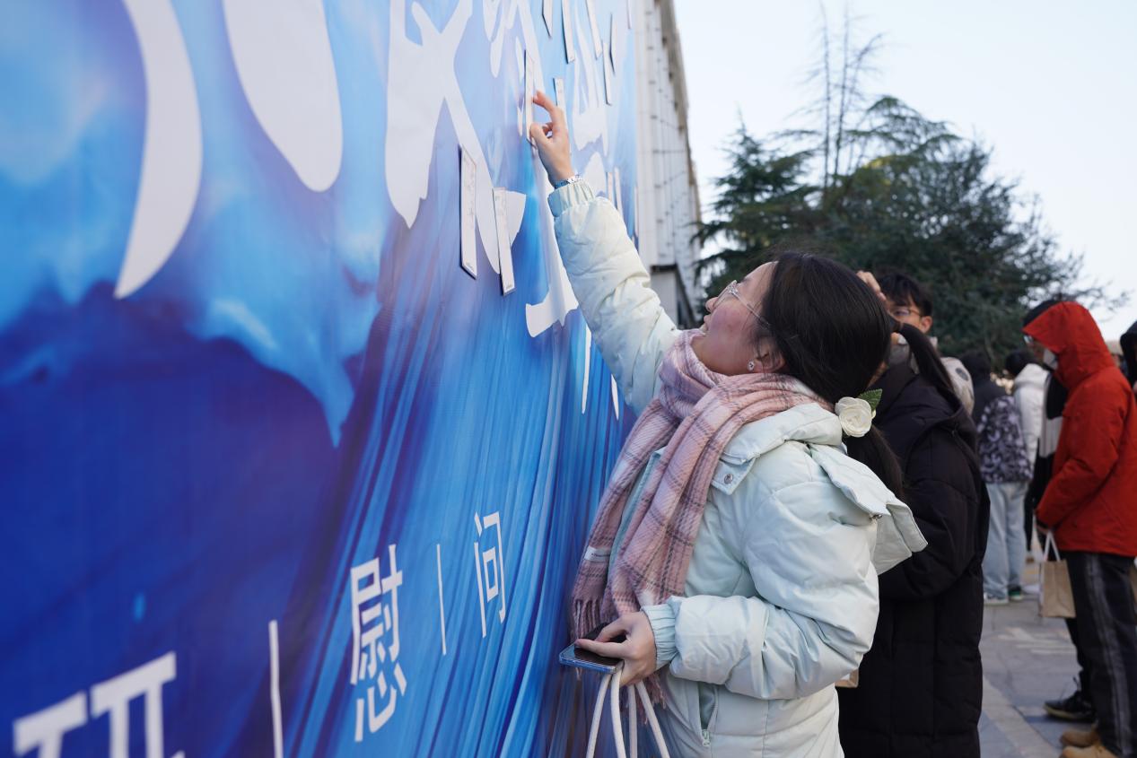 “全力以赴!加油!”“稳住心态、下笔如有神,我一定会上岸的!”……同学们纷纷将心愿写在心愿卡上,或垫着脚尖,或一跃而起,努力将心愿卡贴到许愿墙的更高处,希冀愿望成真。