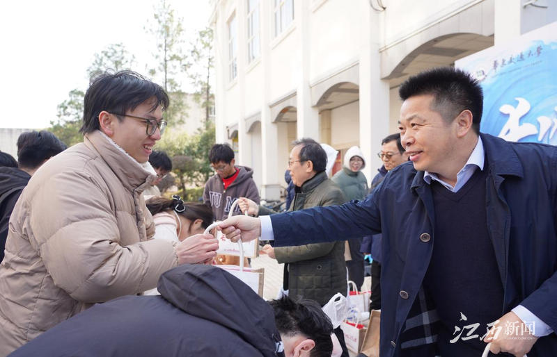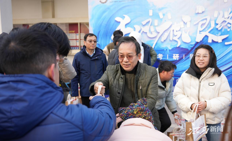 ▲该校党委副书记、校长徐长节为考研学子送上考研加油包