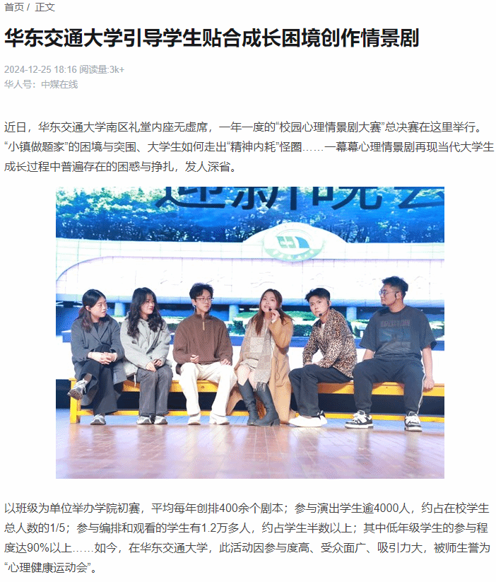 以班级为单位举办学院初赛,平均每年创排400余个剧本;参与演出学生逾4000人,约占在校学生总人数的1/5;参与编排和观看的学生有1.2万多人,约占学生半数以上;其中低年级学生的参与程度达90%以上……如今,在beat365正版唯一官网必一,此活动因参与度高、受众面广、吸引力大,被师生誉为“心理健康运动会”。