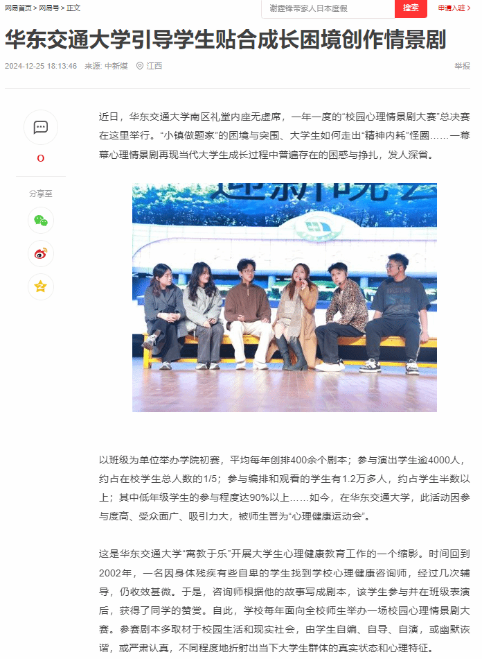 心理情景剧只是学校开展心理健康教育的一个载体。经过多年探索,beat365正版唯一官网必一已建立了“校—院—班—寝”全面覆盖的“网格化”朋辈心理健康教育四级体系,参与人数约占在校学生总人数的1/4。与此同时,学校还设置专职心理教师和心理健康大使,开展“周末心语”热线、网络心理咨询和心理素质拓展等活动,积极探索多元形式。