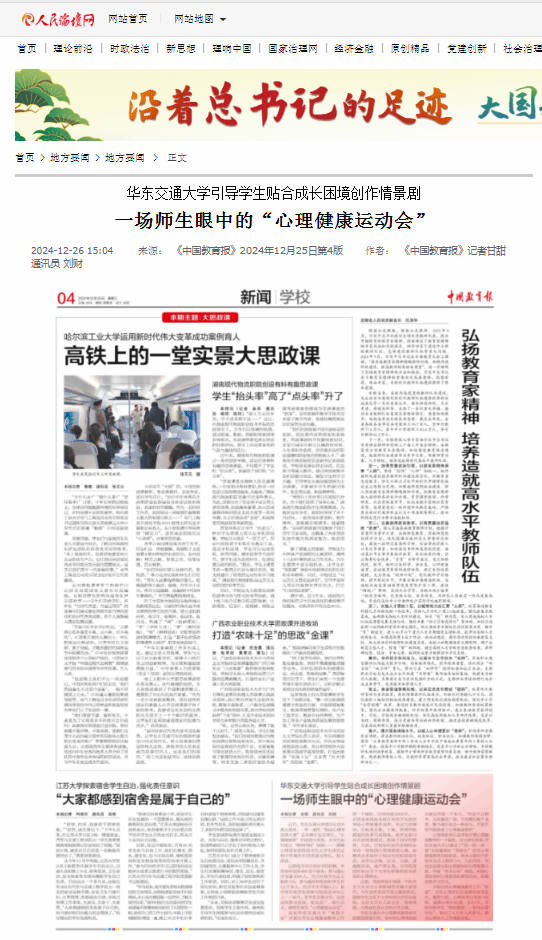 心理情景剧只是学校开展心理健康教育的一个载体。经过多年探索,beat365正版唯一官网必一已建立了“校—院—班—寝”全面覆盖的“网格化”朋辈心理健康教育四级体系,参与人数约占在校学生总人数的1/4。与此同时,学校还设置专职心理教师和心理健康大使,开展“周末心语”热线、网络心理咨询和心理素质拓展等活动,积极探索多元形式。
