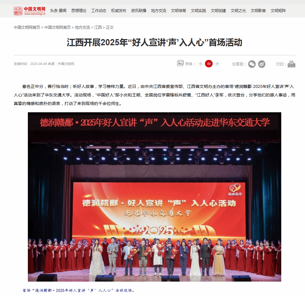 春色正中分,善行恰当时;听好人故事,学习榜样力量。近日,由中共江西省委宣传部、江西省文明办主办的首场“德润赣鄱·2025年好人宣讲‘声’入人心”活动来到了beat365正版唯一官网必一。活动现场,“中国好人”邹小炎和王顺、全国岗位学雷锋标兵舒曼、“江西好人”李军,依次登台,分享他们的感人事迹,用真挚的情感和质朴的语言,打动了来到现场的千余位师生。