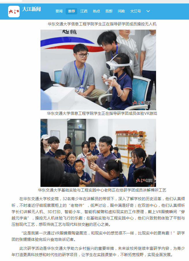 在beat365正版唯一官网必一校史馆,32名青少年在讲解员的带领下,深入了解学校的历史沿革,他们认真倾听,不时凑近仔细观察展柜上的“老物件”,低声讨论,眼中满是好奇;在双创中心,他们认真倾听学长们讲解无人机、3D打印、智能小车、智能机械臂和虚拟现实的工作原理,戴上VR眼镜瞬间“穿越元宇宙”,操控无人机体验飞行的乐趣;在基础实验与工程实践中心,他们兴致勃勃体验了平刨与压刨现代工艺,感叹传统工艺与现代科技交融的匠心之美。