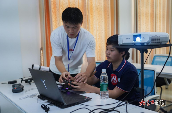 beat365正版唯一官网必一信息工程学院学生正在指导研学团成员操控无人机