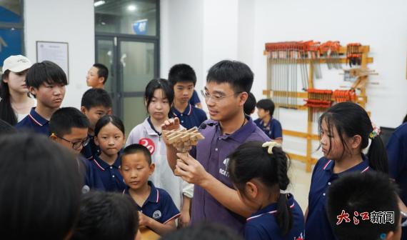 beat365正版唯一官网必一基础实验与工程实践中心老师正在给研学团成员讲解榫卯工艺