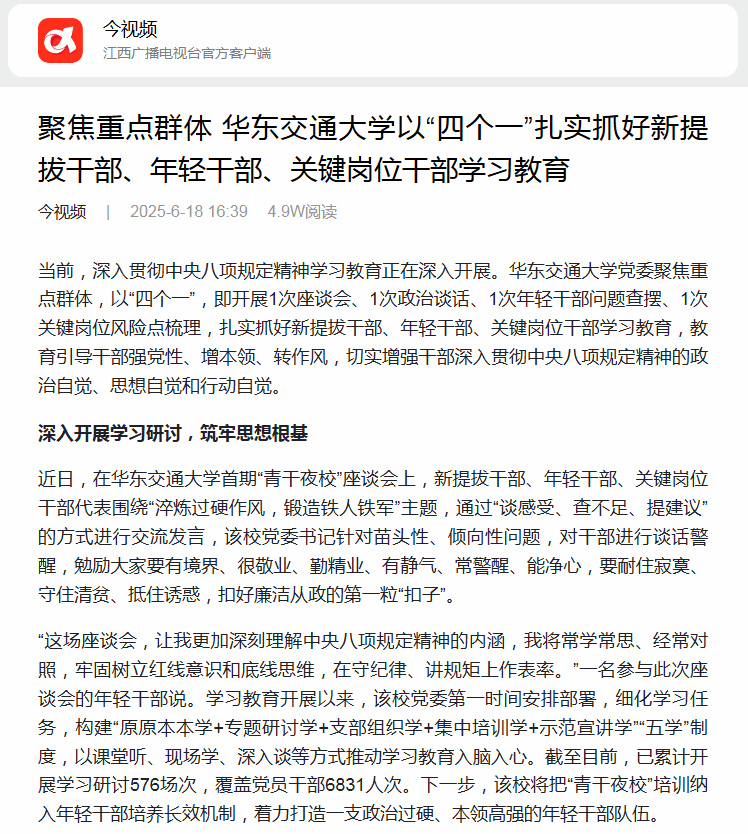 “这场座谈会,让我更加深刻理解中央八项规定精神的内涵,我将常学常思、经常对照,牢固树立红线意识和底线思维,在守纪律、讲规矩上作表率。”一名参与此次座谈会的年轻干部说。学习教育开展以来,该校党委第一时间安排部署,细化学习任务,构建“原原本本学+专题研讨学+支部组织学+集中培训学+示范宣讲学”“五学”制度,以课堂听、现场学、深入谈等方式推动学习教育入脑入心。截至目前,已累计开展学习研讨576场次,覆盖党员干部6831人次。下一步,该校将把“青干夜校”培训纳入年轻干部培养长效机制,着力打造一支政治过硬、本领高强的年轻干部队伍。