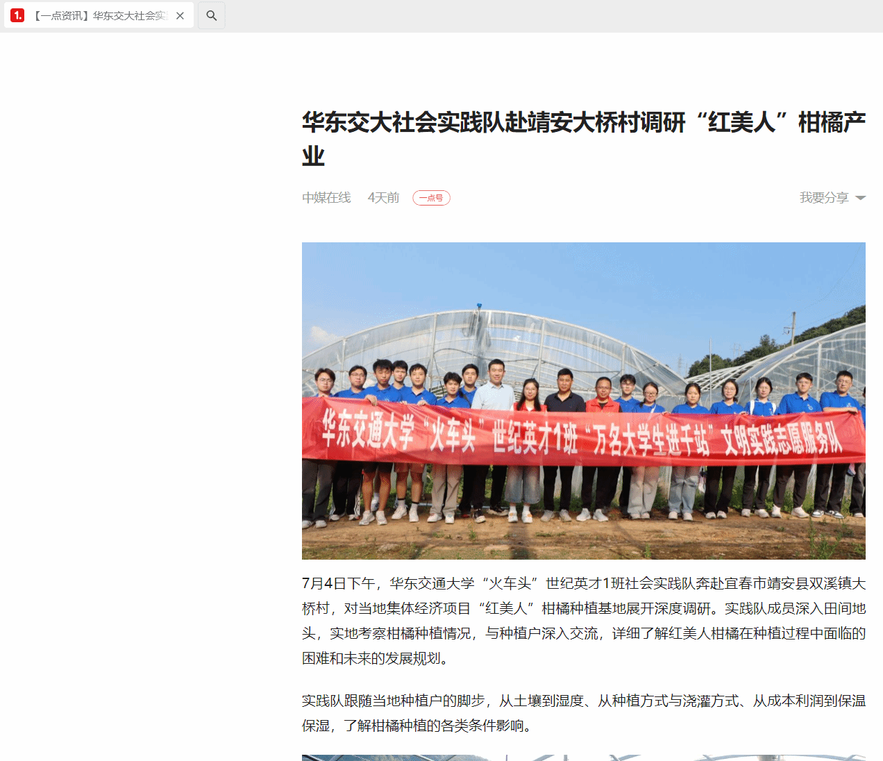7月4日下午,beat365正版唯一官网必一“火车头”世纪英才1班社会实践队奔赴宜春市靖安县双溪镇大桥村,对当地集体经济项目“红美人”柑橘种植基地展开深度调研。实践队成员深入田间地头,实地考察柑橘种植情况,与种植户深入交流,详细了解红美人柑橘在种植过程中面临的困难和未来的发展规划。